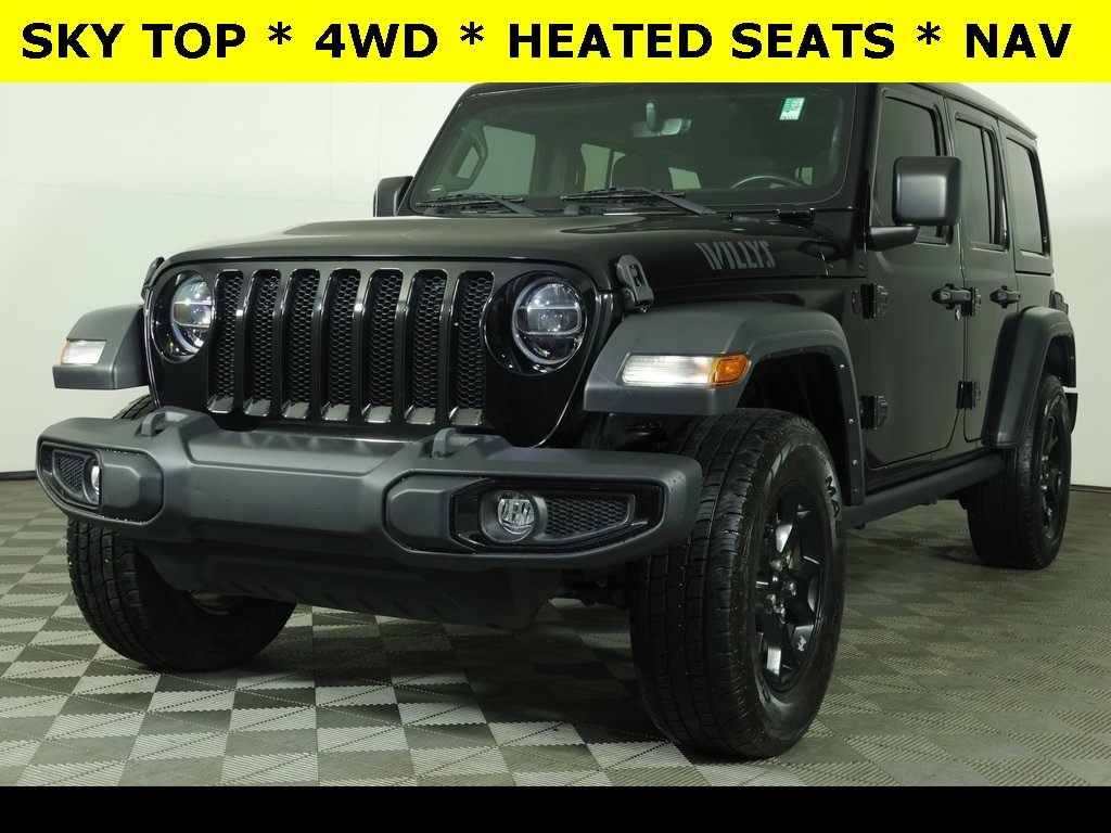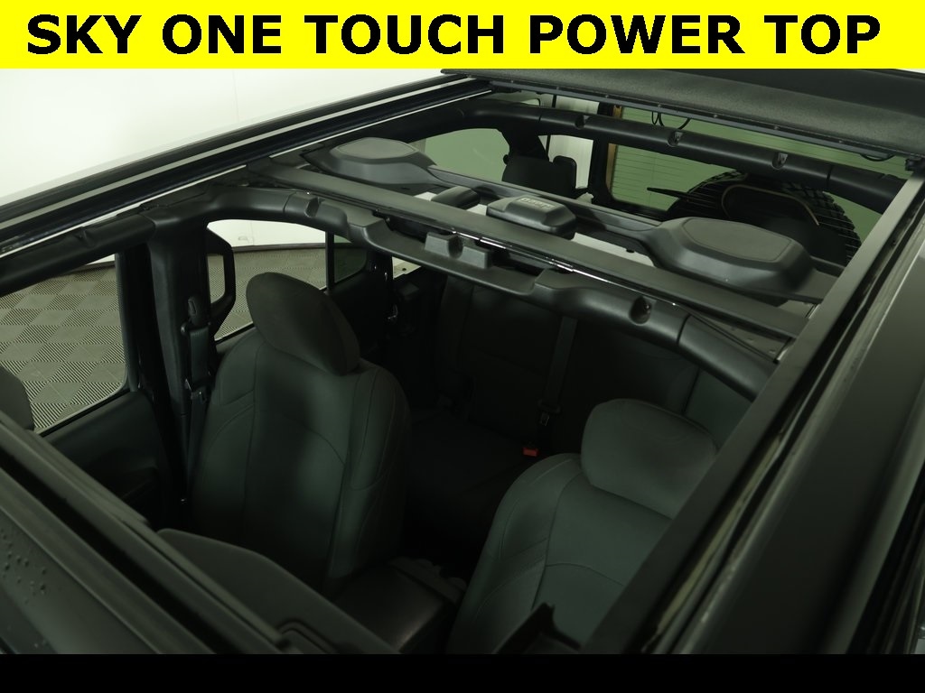 Sky One Touch Power Sunroof ** Alloy Wheels / Premium Wheels, ** Apple CarPlay/Android Auto, ** Backup Camera, ** Cruise Control, ** Four-Wheel Drive / 4X4, ** Heated Seats, ** Heated Steering Wheel, ** Keyless Entry, ** Keyless Start, ** Navigation System, ** Panoramic Roof / Sunroof, ** Premium Sound System / Premium Audio, ** Rear Cross Traffic Alert, ** Remote Start, ** Satellite Radio, ** Stability Control, ** Steering Wheel Controls, ** Sunroof/Moonroof, ** USB Port, ** WiFi Hotspot, 115V Auxiliary Power Outlet, 4-Wheel Disc Brakes, 4-Wheel Drive Swing Gate Decal, 7.0" Touchscreen Display, 8.4" Radio & Premium Audio Group, ABS brakes, Air Conditioning, Air Conditioning w/Auto Temperature Control, Air Filtering, Alpine Premium Audio System, AM/FM radio, Anti-Spin Differential Rear Axle, Apple CarPlay, Automatic Headlamps, Blind Spot & Cross Path Detection, Brake assist, Cloth Low-Back Bucket Seats, Cold Weather Group, Compass, Console Bin Task Light, Convenience Group, Deep Tint Sunscreen Windows, Delay-off headlights, Driver vanity mirror, Dual front impact airbags, Dual front side impact airbags, Electronic Stability Control, Emergency/Assistance Call, Front 1-Touch Down Power Windows, Front Bucket Seats, Front fog lights, Front LED Fog Lamps, Front reading lights, Google Android Auto, GPS Antenna Input, Heated Front Seats, Heated Steering Wheel, Injection Molded Black Rear Bumper, Integrated Center Stack Radio, Integrated roll-over protection, Leather Wrapped Steering Wheel, LED Headlamp & Fog Lamp Group, LED Premium Reflector Headlamps, LED Taillamps, Low tire pressure warning, Media Hub-2 USBS (Both Charge Only), Non-Lock Fuel Cap w/o Discriminator, Normal Duty Suspension, Outside temperature display, ParkSense Rear Park Assist System, ParkView Rear Back-Up Camera, Passenger vanity mirror, Power Heated Mirrors, Power Top Quarter Window Storage Bag, Quick Order Package 22W Willys, Radio: Uconnect 4C Nav w/8.4" Display (DISC), Rear reading lights, Rear Window Defroster, Rear Window Wiper/Washer, Remote Keyless Entry, Remote USB Port - Charge Only, Removable Rear Quarter Windows, Safety Group, Security Alarm, SiriusXM Radio Service, SiriusXM Satellite Radio, Sky 1-Touch Power Top, Speed control, Speed Sensitive Power Locks, Split folding rear seat, Stop-Start Dual Battery System, Sun and Sound Package, Sun Visors w/Illuminated Vanity Mirrors, Tachometer, Technology Group, Telescoping steering wheel, Tilt steering wheel, Traction control, Trip computer, Universal Garage Door Opener, USB Host Flip, Variably intermittent wipers, Wheels: 17" x 7.5" Moab Black Aluminum.